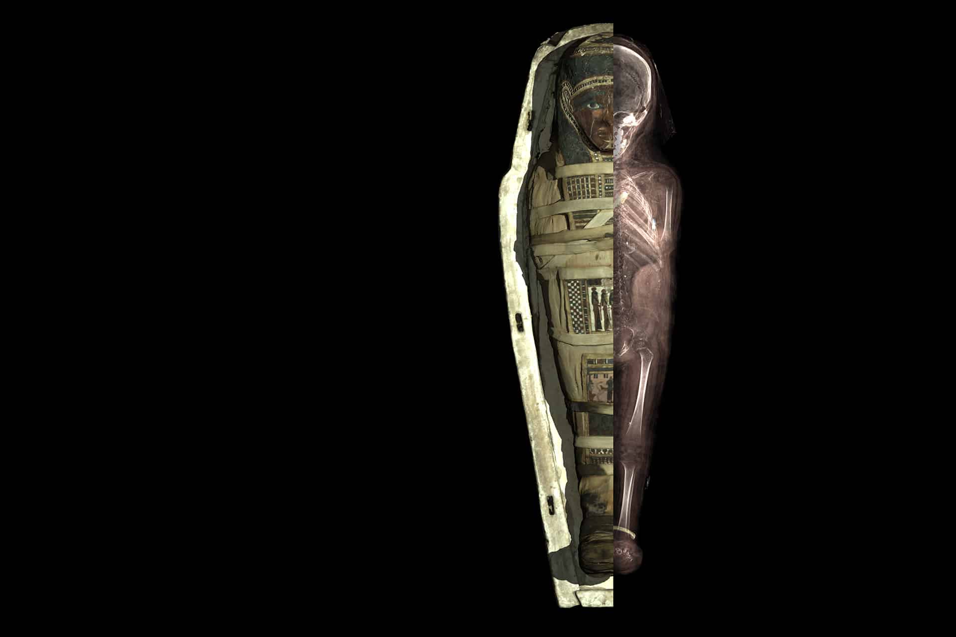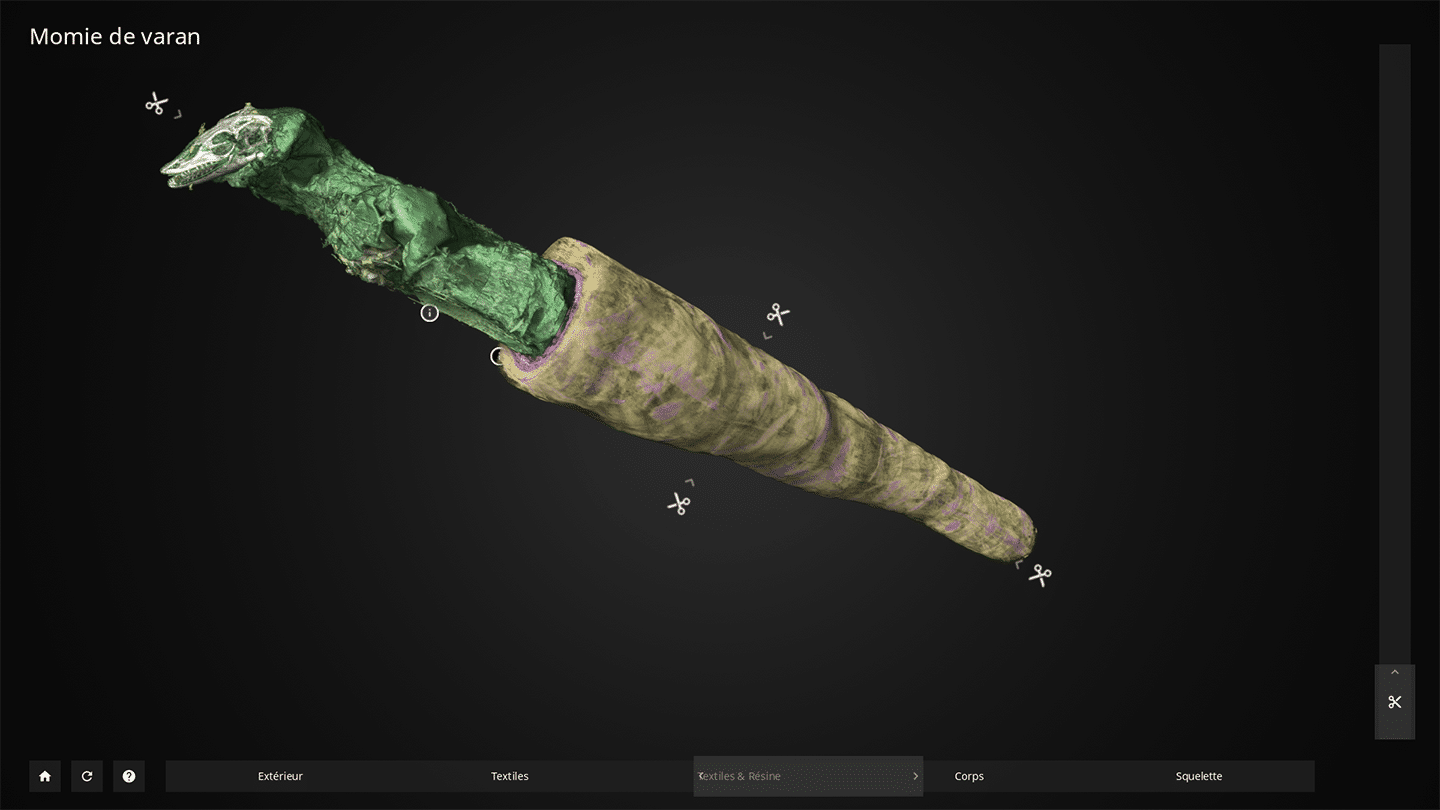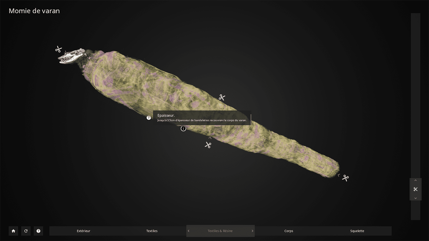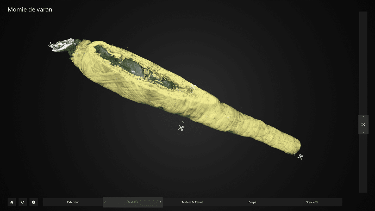 This interactive exploration application allows for virtual unwrapping of the mummy, offering the possibility of removing layers one by one (removing the wrappings, exploring the textiles, exploring the remaining muscle tissue, mummification techniques, etc.) until reaching the skeleton.