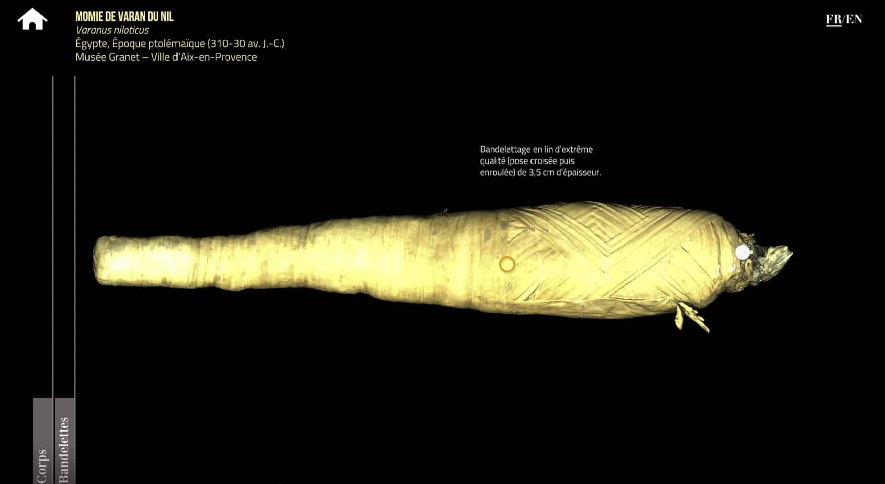 IMA Solutions performed the X-ray tomography acquisition of a monitor lizard mummy, as well as the 3D exploration and manipulation application.